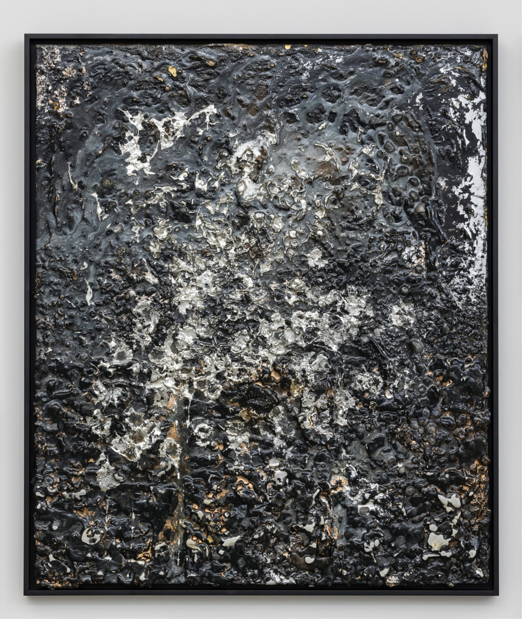 錫のきらめきが散りばめられた立体的な作品は、深みのある色彩と共に、控えめながらも確かな存在感を放つ。